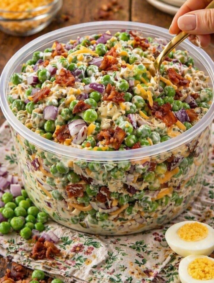 This Creamy Bacon Pea Salad is a fresh, flavorful side dish packed with sweet peas, crispy bacon, sharp cheddar, and a rich, tangy dressing. It’s the perfect balance of creamy, crunchy, and savory—making it a favorite for potlucks, BBQs, and family dinners.