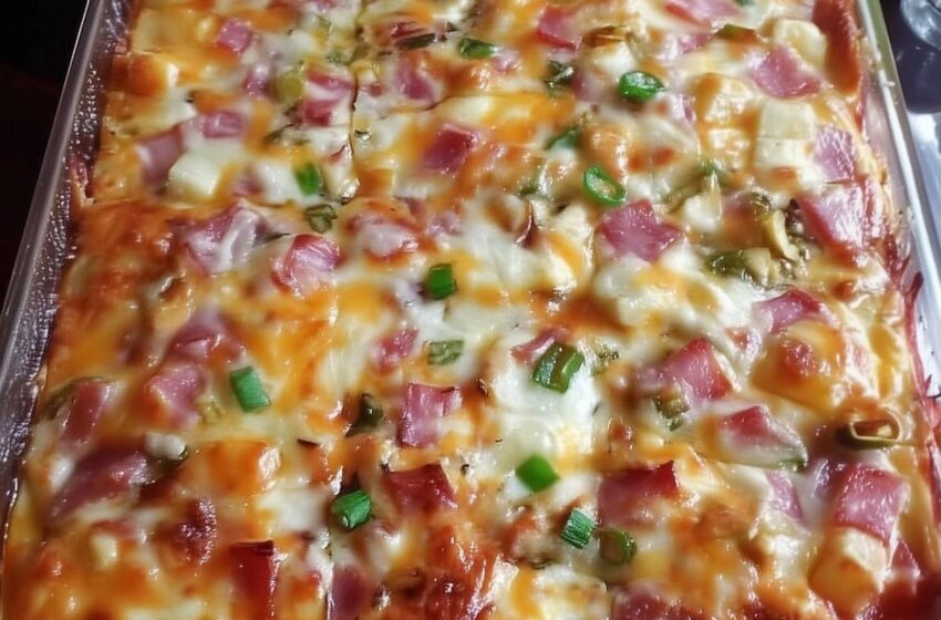 Sprinkle the Monterey Jack cheese, diced ham, and chopped green onions on top. - Mix the Egg Filling