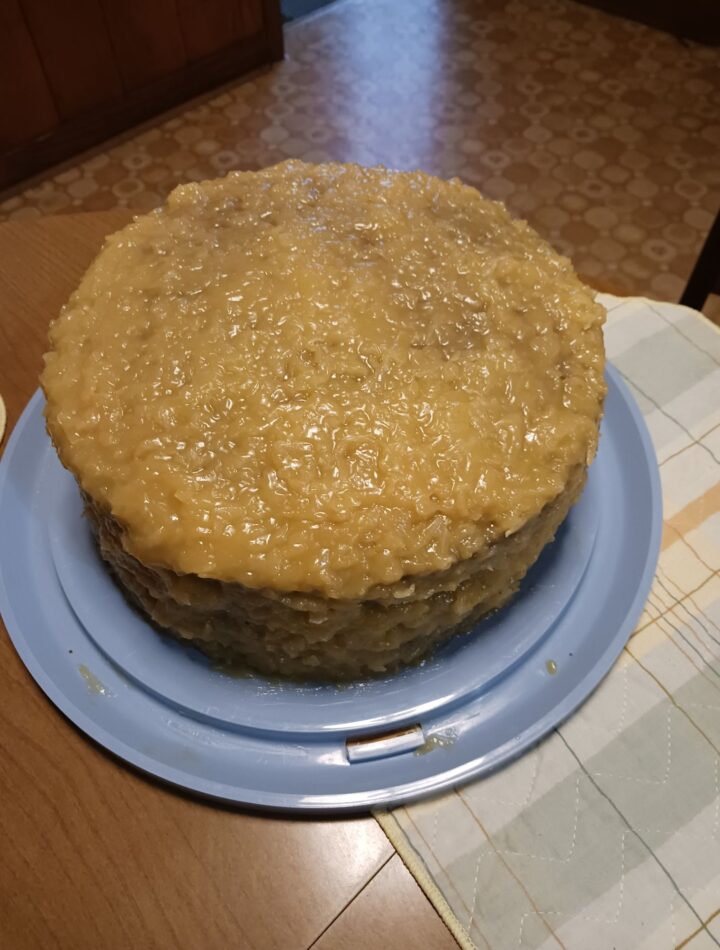 - Remove from heat and stir in coconut, pecans, and vanilla. Let cool before frosting.