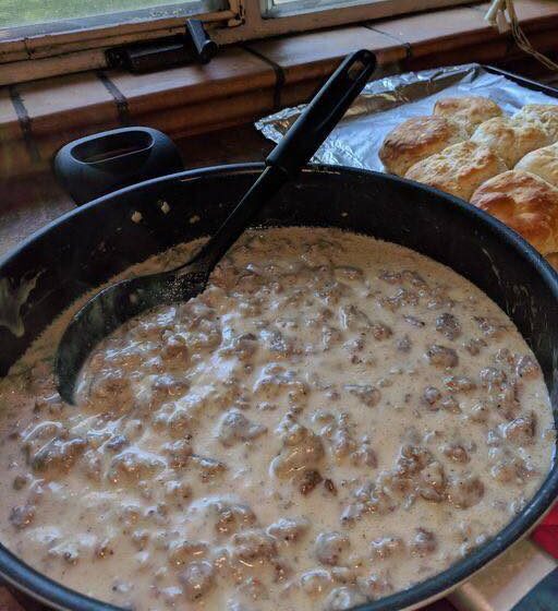 - ✅ Uses simple pantry staples – flour, milk, sausage, salt, and pepper.
