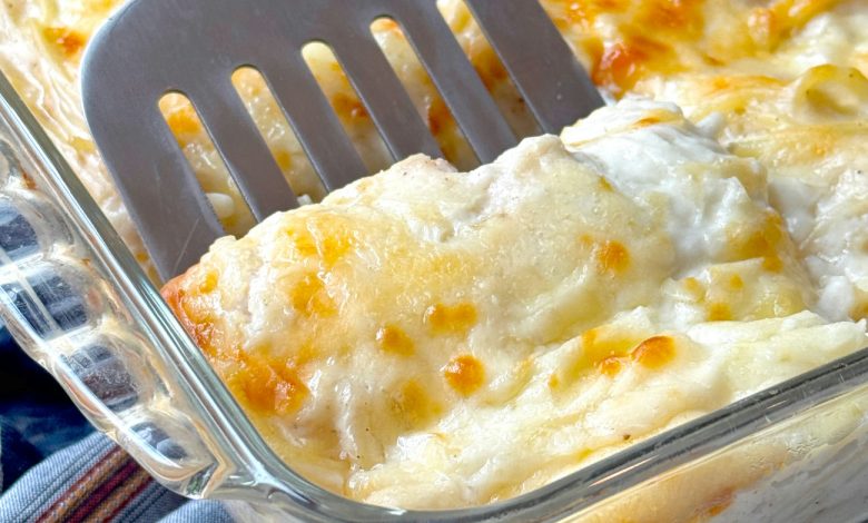 - Preheat & Prep: Preheat your oven to 375°F (190°C). Grease a 9×13-inch baking dish (or two 8×8-inch dishes) with baking spray and set it aside.