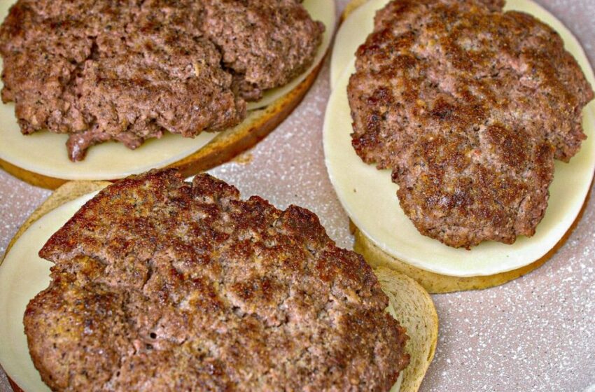 - Top each slice of bread with 2 slices of provolone cheese, a meat patty and 2 slices of cheddar cheese.