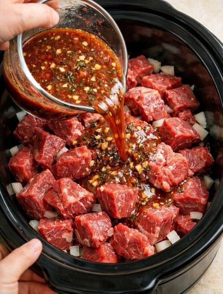 Place the beef cubes at the bottom of the slow cooker. Add the chopped potatoes and onion on top.