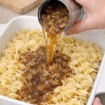 Pour in the beef broth, then add the cream of mushroom soup. Stir gently to combine everything.