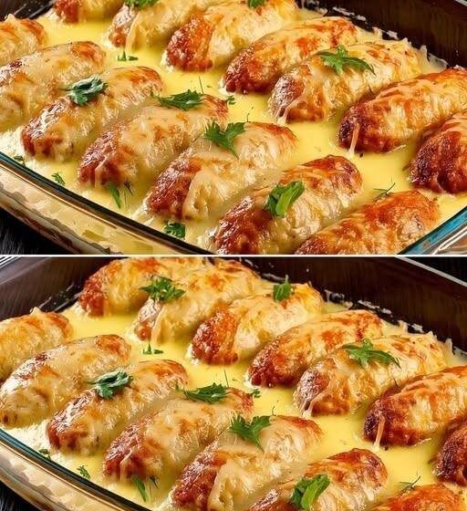 Cover with foil and bake for 45–50 minutes, then uncover and bake for 10–15 more minutes, until the sauce bubbles and the rolls are tender.